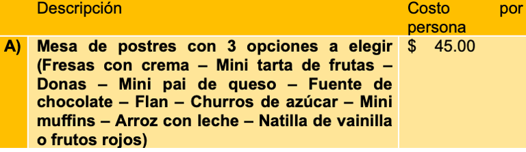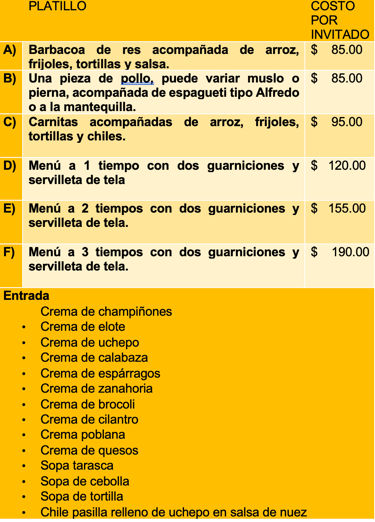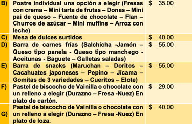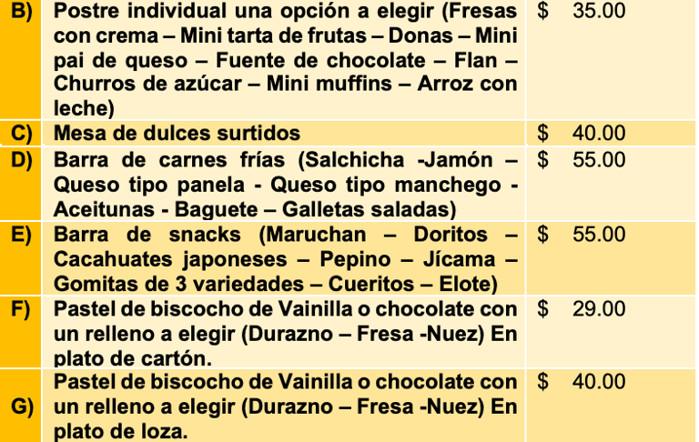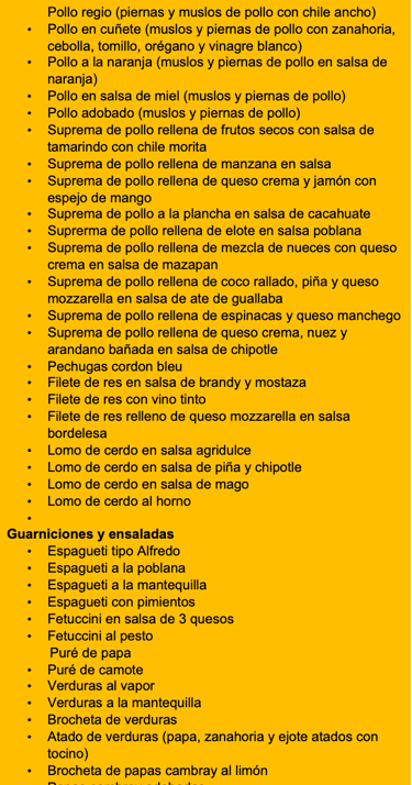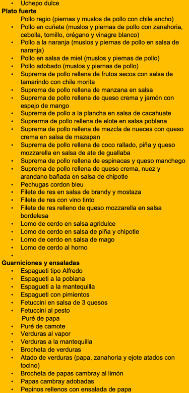 adobadas, ensalada rusa) 3 proteínas (pastel